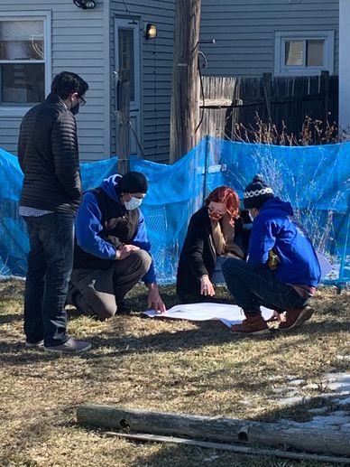 Two beautiful river birch trees installed. Courtney and Kayla begin design layout for plants and shrubs.