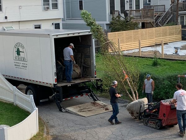 Sylvan Nursery delivery today! Emilio oversees the offloading of multi-stem river birch trees, plants, and shrubs.
